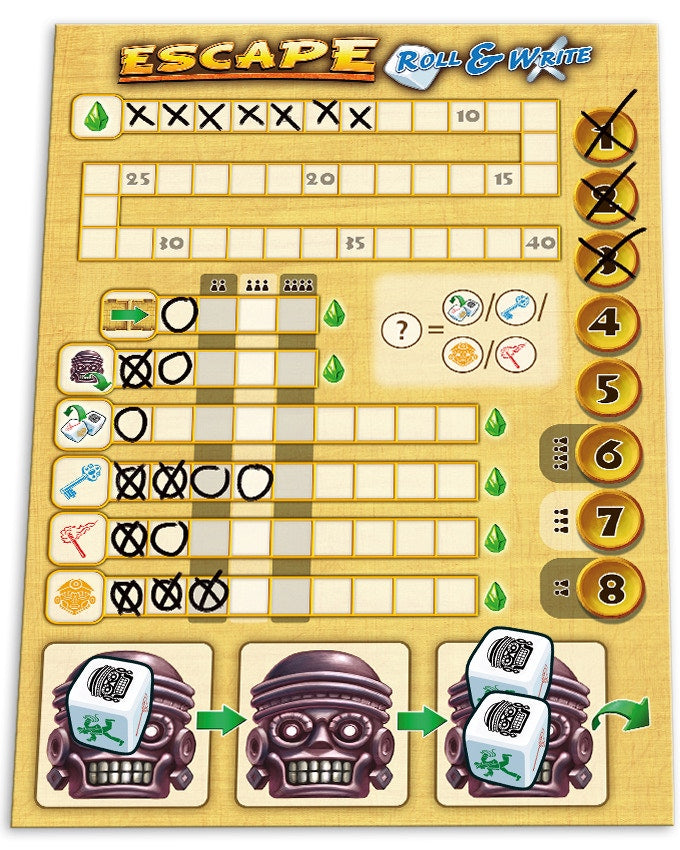 Encore ! Un joueur lance les 6 dés, en prend deux et coche le résultat. Les autres joueurs choisissent 2 des 4 dés restants et cochent des cases sur leur feuille de jeu. Seules les colonnes complètes apportent des points. Il s’agit donc de bien peser le pour et le contre et de faire les bons choix. ENCORE! est un jeu génial … on y rejoue encore ...