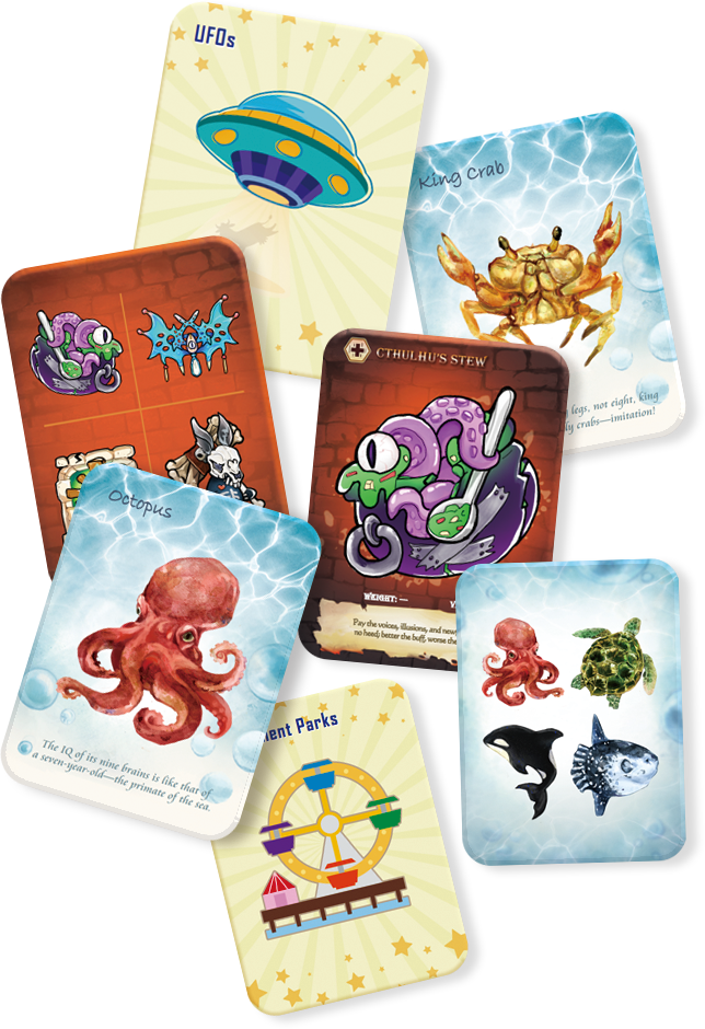 Taco Chat Poulet Poutine Pizza Gardez bien ces 5 mots loufoques en tête. Dès qu’une carte correspondant au mot annoncé est révélée, tapez la pile centrale. Le dernier ramasse tout! Soyez observateurs et vifs pour vous débarrasser de toutes vos cartes! La moindre erreur vous coûtera des cartes de pénalité: ni feinte, ni approximation dans ce jeu...