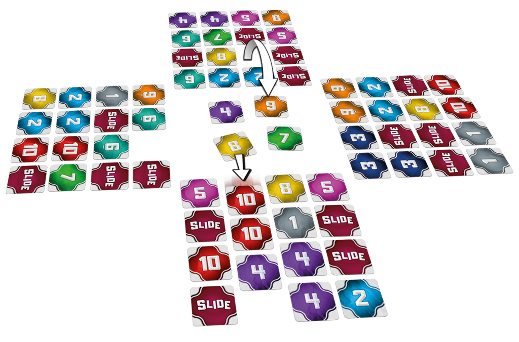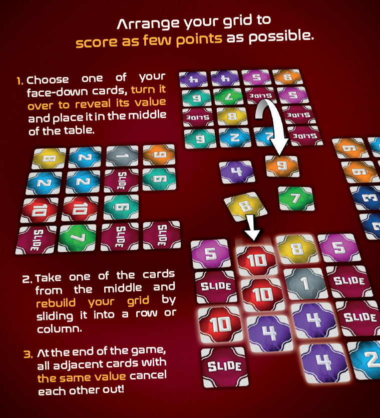 Skyjo Action Nouvelle version de Skyjo qui ajoute des cartes d'action et des cartes joker. Dans Skyjo, chaque joueur a 12 cartes dans un modèle 3x4, deux d'entre elles sont visibles, toutes les autres sont cachées. À votre tour, vous pouvez prendre la carte du dessus de la défausse ou piocher dans la pile. Vous pouvez échanger une carte (caché...