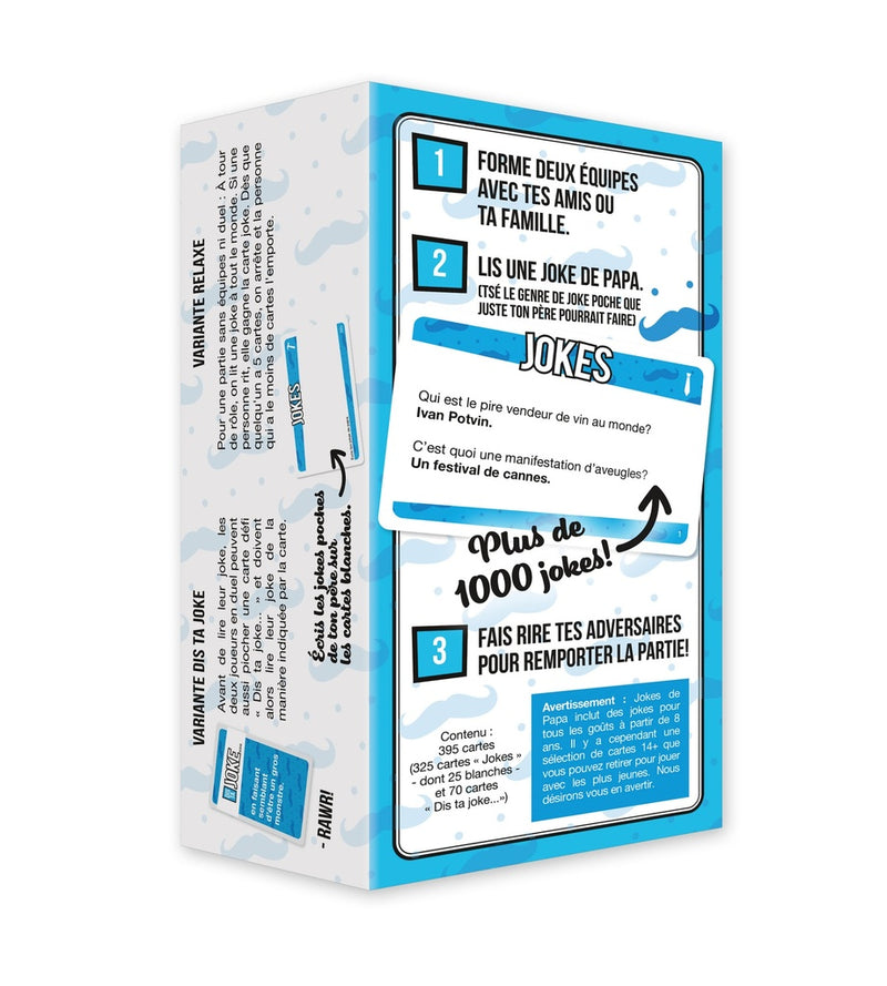 {"id":166285148172,"title":"Jokes de Papa 2e édition","handle":"jokes-de-papa","description":"\u003ch2\u003eJokes de Papa 2e edition\u003c\/h2\u003e\n\u003cp\u003eMême jeu, nouveau format! Jokes de Papa est de retour dans un nouveau format pratique!\u003cbr\u003e\u003cbr\u003eDans Jokes de Papa, le but est simple : on forme deux équipes et un joueur de chaque équipe se place face à face pour s’affronter en duel. Un des deux pioche une carte « jokes » et lit une joke. Les deux joueurs en duel ne doivent pas rire. Si l’un d’eux rit, l’autre équipe remporte une carte.\u003cbr\u003e\u003cbr\u003ePour faire rire les joueurs sérieux, on ajoute les cartes « dis ta joke… ». Il faut alors lire la joke de la manière inscrite sur la carte.\u003cbr\u003e\u003cbr\u003ePlus de 1000 jokes complètement loufoques pour faire rire même les plus sérieux!\u003c\/p\u003e\n\u003cp\u003e\u003cimg src=\"https:\/\/cdn.shopify.com\/s\/files\/1\/0578\/0717\/files\/Age_icon.png?v=1516673454\" alt=\"\"\u003e 8 + \u003cimg src=\"https:\/\/cdn.shopify.com\/s\/files\/1\/0578\/0717\/files\/Timer_icon.png?v=1516673454\" alt=\"\"\u003e 30 min \u003cimg src=\"https:\/\/cdn.shopify.com\/s\/files\/1\/0578\/0717\/files\/Players_icon.png?v=1516673454\" alt=\"\"\u003e 2 - 12 Joueurs\u003c\/p\u003e","published_at":"2018-03-16T21:52:19-04:00","created_at":"2018-01-28T19:04:18-05:00","vendor":"Randolph","type":"Jeu","tags":["Catégories_Party","Dist_Randolph","Durée_ 20 à 30 min","Joueur(s)_ 2 joueurs","Joueur(s)_ 3 joueurs","Joueur(s)_ 4 joueurs","Joueur(s)_ 5 joueurs","Joueur(s)_ 6 joueurs","Joueur(s)_ 7 joueurs","Joueur(s)_ 8 joueurs","Joueur(s)_Plus de 8 joueurs","Langue_Français","Prix_20 à 40$","Âge_ 8+"],"price":2999,"price_min":2999,"price_max":2999,"available":true,"price_varies":false,"compare_at_price":0,"compare_at_price_min":0,"compare_at_price_max":0,"compare_at_price_varies":false,"variants":[{"id":1670650003468,"title":"Default Title","option1":"Default Title","option2":null,"option3":null,"sku":"RANDJDPFR-01","requires_shipping":true,"taxable":true,"featured_image":null,"available":true,"name":"Jokes de Papa 2e édition","public_title":null,"options":["Default Title"],"price":2999,"weight":0,"compare_at_price":0,"inventory_quantity":0,"inventory_management":"shopify","inventory_policy":"continue","barcode":"832665000053","requires_selling_plan":false,"selling_plan_allocations":[]}],"images":["\/\/www.infinijeux.com\/cdn\/shop\/products\/RANDJDPFR-01_JokesdePapa-Reedition.jpg?v=1646689340","\/\/www.infinijeux.com\/cdn\/shop\/products\/JokesdePapa-Reedition_1.jpg?v=1646689344","\/\/www.infinijeux.com\/cdn\/shop\/products\/JokesdePapa-Reedition.jpg?v=1646689349"],"featured_image":"\/\/www.infinijeux.com\/cdn\/shop\/products\/RANDJDPFR-01_JokesdePapa-Reedition.jpg?v=1646689340","options":["Title"],"media":[{"alt":null,"id":22410307240019,"position":1,"preview_image":{"aspect_ratio":0.899,"height":1024,"width":921,"src":"\/\/www.infinijeux.com\/cdn\/shop\/products\/RANDJDPFR-01_JokesdePapa-Reedition.jpg?v=1646689340"},"aspect_ratio":0.899,"height":1024,"media_type":"image","src":"\/\/www.infinijeux.com\/cdn\/shop\/products\/RANDJDPFR-01_JokesdePapa-Reedition.jpg?v=1646689340","width":921},{"alt":null,"id":22410307436627,"position":2,"preview_image":{"aspect_ratio":0.899,"height":1024,"width":921,"src":"\/\/www.infinijeux.com\/cdn\/shop\/products\/JokesdePapa-Reedition_1.jpg?v=1646689344"},"aspect_ratio":0.899,"height":1024,"media_type":"image","src":"\/\/www.infinijeux.com\/cdn\/shop\/products\/JokesdePapa-Reedition_1.jpg?v=1646689344","width":921},{"alt":null,"id":22410307502163,"position":3,"preview_image":{"aspect_ratio":1.272,"height":805,"width":1024,"src":"\/\/www.infinijeux.com\/cdn\/shop\/products\/JokesdePapa-Reedition.jpg?v=1646689349"},"aspect_ratio":1.272,"height":805,"media_type":"image","src":"\/\/www.infinijeux.com\/cdn\/shop\/products\/JokesdePapa-Reedition.jpg?v=1646689349","width":1024}],"requires_selling_plan":false,"selling_plan_groups":[],"content":"\u003ch2\u003eJokes de Papa 2e edition\u003c\/h2\u003e\n\u003cp\u003eMême jeu, nouveau format! Jokes de Papa est de retour dans un nouveau format pratique!\u003cbr\u003e\u003cbr\u003eDans Jokes de Papa, le but est simple : on forme deux équipes et un joueur de chaque équipe se place face à face pour s’affronter en duel. Un des deux pioche une carte « jokes » et lit une joke. Les deux joueurs en duel ne doivent pas rire. Si l’un d’eux rit, l’autre équipe remporte une carte.\u003cbr\u003e\u003cbr\u003ePour faire rire les joueurs sérieux, on ajoute les cartes « dis ta joke… ». Il faut alors lire la joke de la manière inscrite sur la carte.\u003cbr\u003e\u003cbr\u003ePlus de 1000 jokes complètement loufoques pour faire rire même les plus sérieux!\u003c\/p\u003e\n\u003cp\u003e\u003cimg src=\"https:\/\/cdn.shopify.com\/s\/files\/1\/0578\/0717\/files\/Age_icon.png?v=1516673454\" alt=\"\"\u003e 8 + \u003cimg src=\"https:\/\/cdn.shopify.com\/s\/files\/1\/0578\/0717\/files\/Timer_icon.png?v=1516673454\" alt=\"\"\u003e 30 min \u003cimg src=\"https:\/\/cdn.shopify.com\/s\/files\/1\/0578\/0717\/files\/Players_icon.png?v=1516673454\" alt=\"\"\u003e 2 - 12 Joueurs\u003c\/p\u003e"}
