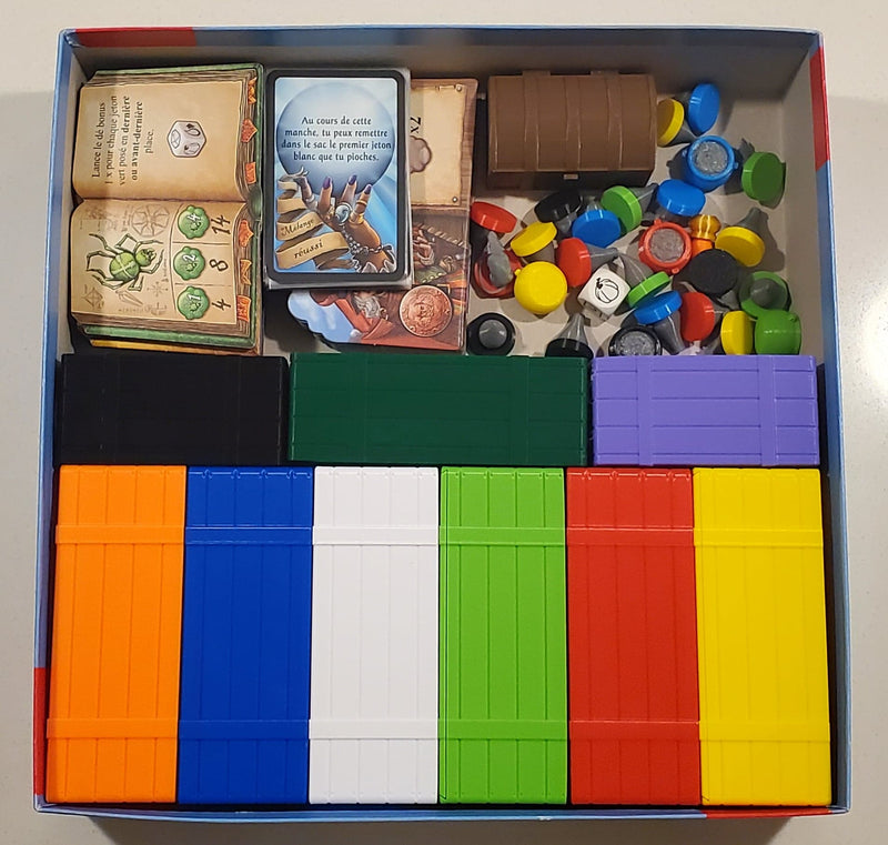 Avec cet ensemble, vous aurez une expérience de jeu supérieure. De plus, cela facilitera la mise en place et le rangement. Les couvercles des coffres d'ingrédients sont rétractables et se ferment à pression pour empêcher qu'ils ouvrent une fois rangés. Chaque coffre est conçu de façon à pouvoir y installer le livre d'ingrédient correspondant. L'ensemble complet entre dans la boîte du jeu original et contient le nombre de coffres et éléments pour être joué avec les extensions: