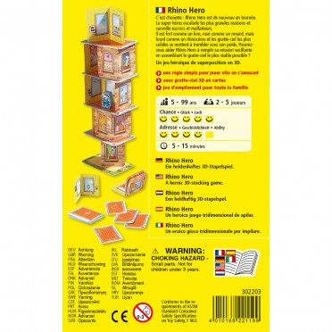 Rhino Hero Rhino Hero est un jeu d'adresse en 3D pour 2 à 5 joueurs mettant en scène un petit rhinocéros héroïque qui grimpe sur la façade d'une maison pour surveiller les méchants.Tiens, mais ce ne serait pas Rhino Hero, là, tout en haut de l'immeuble ? Et oui, il est de nouveau en vadrouille ! Ce rhinocéros hors du commun escalade les plus hau...