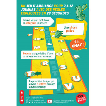 Mots Rapido CE PRIX EST POUR LA LOCATION DU JEU SEULEMENT Dépôt à la réception du jeu : 10$ Le premier joueur qui énonce haut et fort un mot débutant avec la lettre dont la couleur correspond à la catégorie remporte la manche et prend la carte. Une nouvelle carte de la réserve est alors retournée et une nouvelle course pour trouver le premier mo...